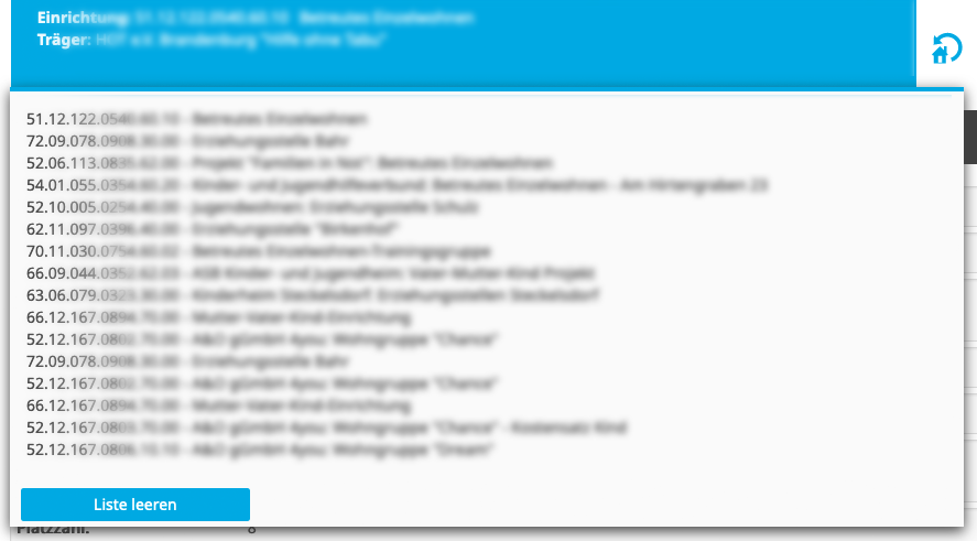 ) können Sie die 20 zuletzt aufgerufenen Einrichtungen einsehen und auswählen.