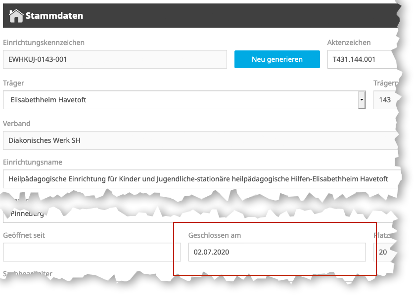 Zu den geschlossenen Einrichtungen zählen die, die in den Stammdaten ein Datum im Feld „Geschlossen am“ haben. Es werden nur Daten, die in der Vergangenheit liegen gewertet.