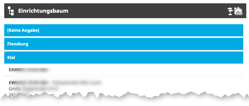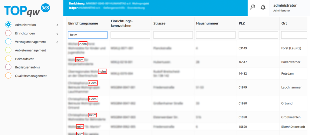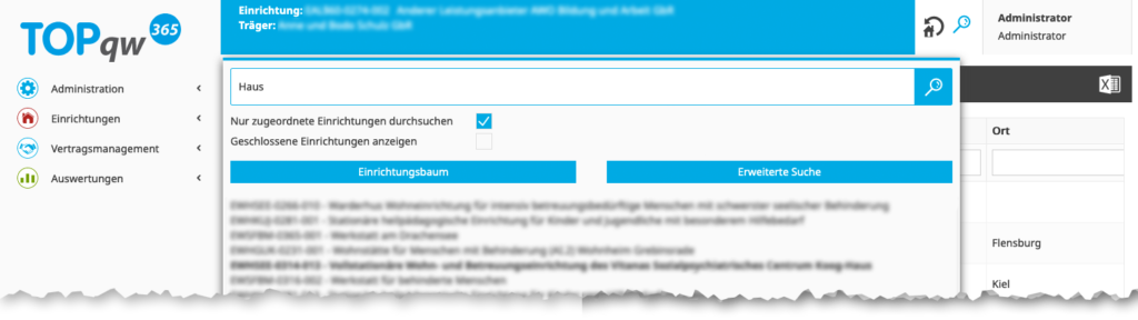 ) können Sie eine Schnellsuche durchführen. Es werden Übereinstimmungen mit den Feldern Einrichtungstyp/-name und Träger angezeigt.