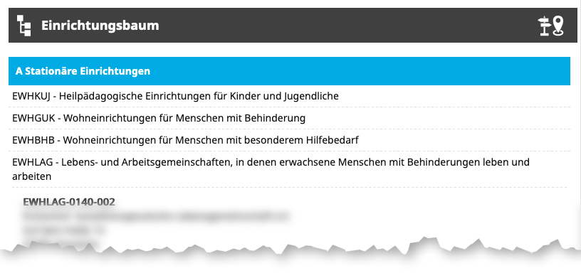 Die Einrichtungsliste zeigt Ihnen die vorhandenen Einrichtungen wahlweise nach Art der Einrichtung oder nach Kreisen sortiert an. Eine direkte Suche ist hier nicht vorgesehen.