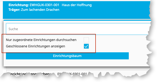 Sie haben die Möglichkeit sich nur die Ihnen zugewiesenen Einrichtungen anzeigen zu lassen. Auch, ob geschlossene Einrichtungen angezeigt werden, sollen können Sie hier definieren.