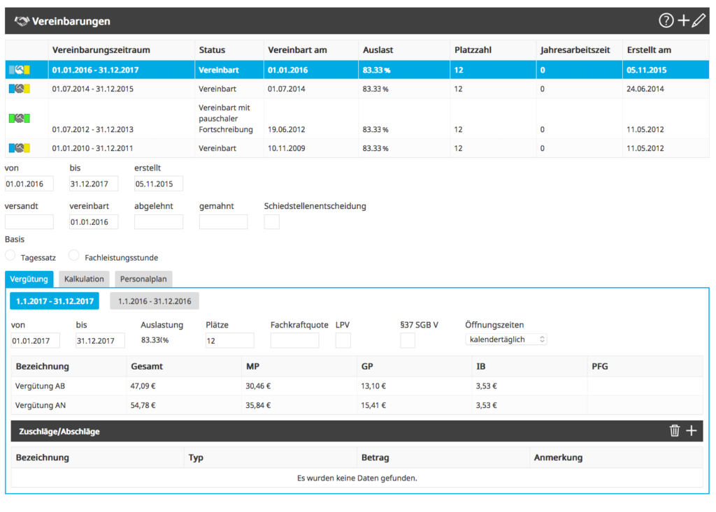 Hier können Sie die vorhandenen Vereinbarungen einsehen, bearbeiten und erstellen.
